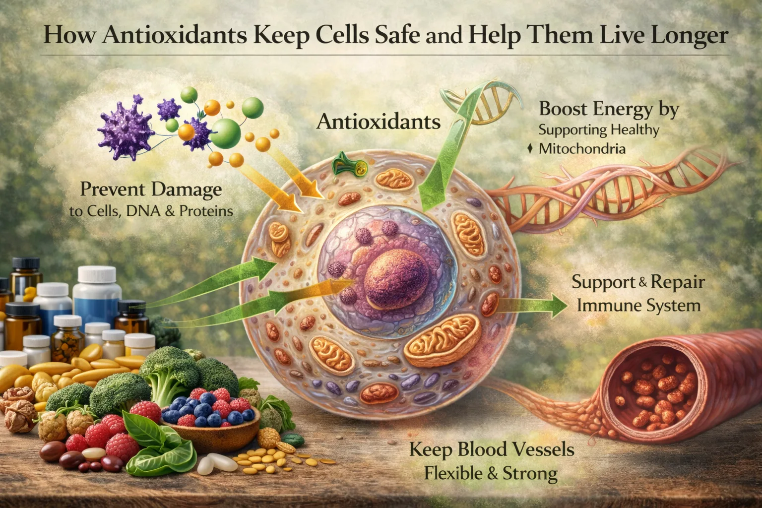 Antioxidants protect the body by stopping free radicals from hurting cells, proteins, and DNA. This protective action helps keep cells healthy, supports healthy blood vessels, and lowers inflammation all over the body.