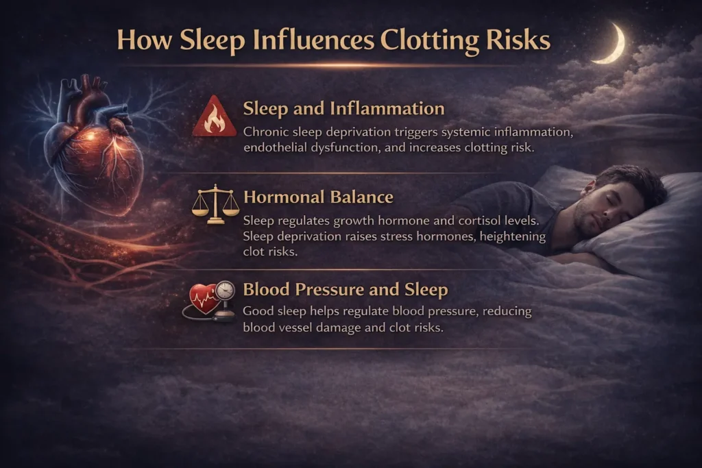 - Hormonal Balance: Sleep controls hormones which control blood clotting and circulation. For example, growth hormone and cortisol concentrations are regulated during sleep. Sleep deprivation may increase cortisol – the hormone of stress – which becomes a part of the inflammation and blood clot process.